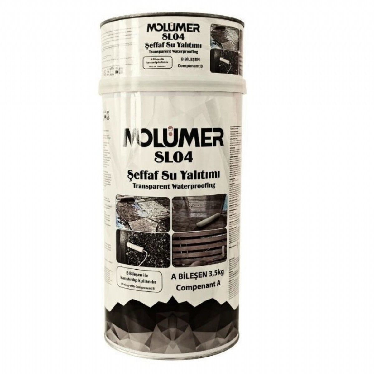 Molümer sıvı cam izolasyon, ÅŸeffaf su yalıtımı olarak bilinir. Bu iki bileÅŸenli ürünün A bileÅŸeni 3,5 kg, B bileÅŸeni ise 0,5 kg’dır.